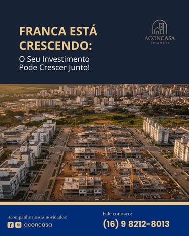 Nos últimos anos, Franca tem se destacado como uma das cidades mais promissoras do Brasil em qualidade de vida, desenvolvimento urbano e valorização imobiliária. O crescimento econômico e a chegada de novos empreendimentos impulsionam o setor e criam oportunidades únicas para quem deseja investir. A Aconcasa acompanha de perto essa expansão e ajuda você a escolher imóveis e terrenos em regiões com alto potencial de valorização. Trabalhamos com transparência e visão estratégica para garantir que cada investimento seja inteligente e rentável. 📞 Invista em uma cidade que não para de crescer! Fale com a Aconcasa e descubra as melhores oportunidades imobiliárias em Franca: (16) 98212-8013.